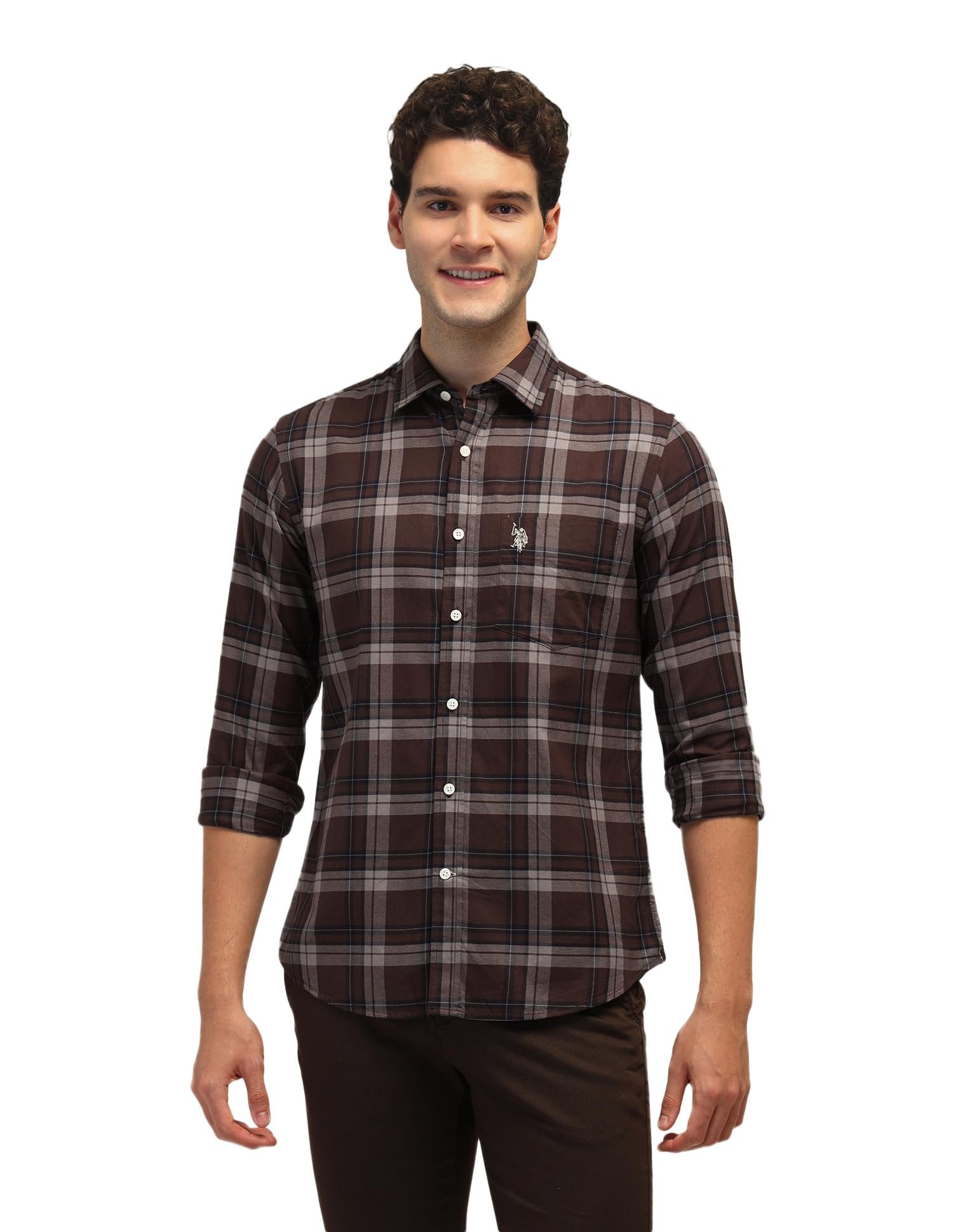 Brand: U.S. POLO ASSN.Color: BrownFeatures: Semi-spread collarLogo at chestFull button placketLong sleeves with rounded cuffsCurved hemlinePackage Dimensions: 57x331x370Details: Description Slay in style with this pure cotton shirt featuring a full button placket and curved hemline.