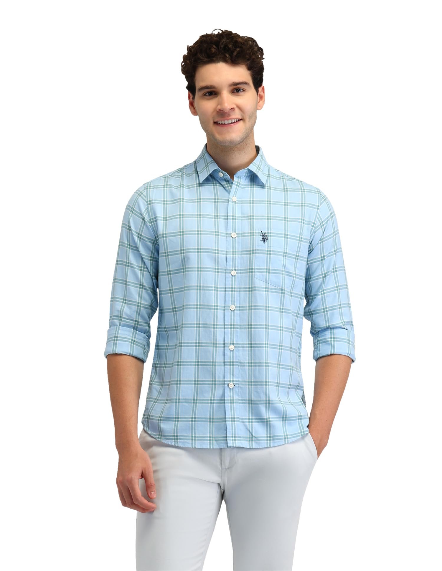 Brand: U.S. POLO ASSN.Color: Light BlueFeatures: Semi-spread collarLogo at chestFull button placketLong sleeves with rounded cuffsCurved hemlinePackage Dimensions: 57x331x370Details: Description Slay in style with this pure cotton shirt featuring a full button placket and curved hemline.