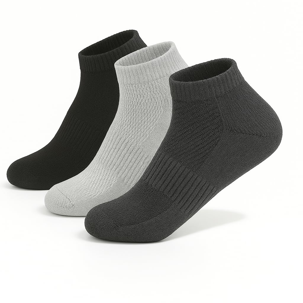 Brand: XJARVISColor: LYON - Black, White, GreyFeatures: DURABLE: Pack of 3 pairs Multiple colors are available for ankle socks (Black, White & Grey socks). All feet fall into the same size between 7 and 11. Included are three sets of cotton ankle socks for men and women that are odor-resistant and have breathable mesh on top of the foot. A remarkably soft and quickly absorbs sweat while keeping your feet dry and protecting them from harm.VERSATILE: Fit For Gym, Casual Wear & Running Our athletic ankle socks are made to be used on a regular basis and improve your performance whether you're doing yoga & gym, cycling, running, walking, standing, travelling, or simply relaxing on the couch. The athletic ankle...