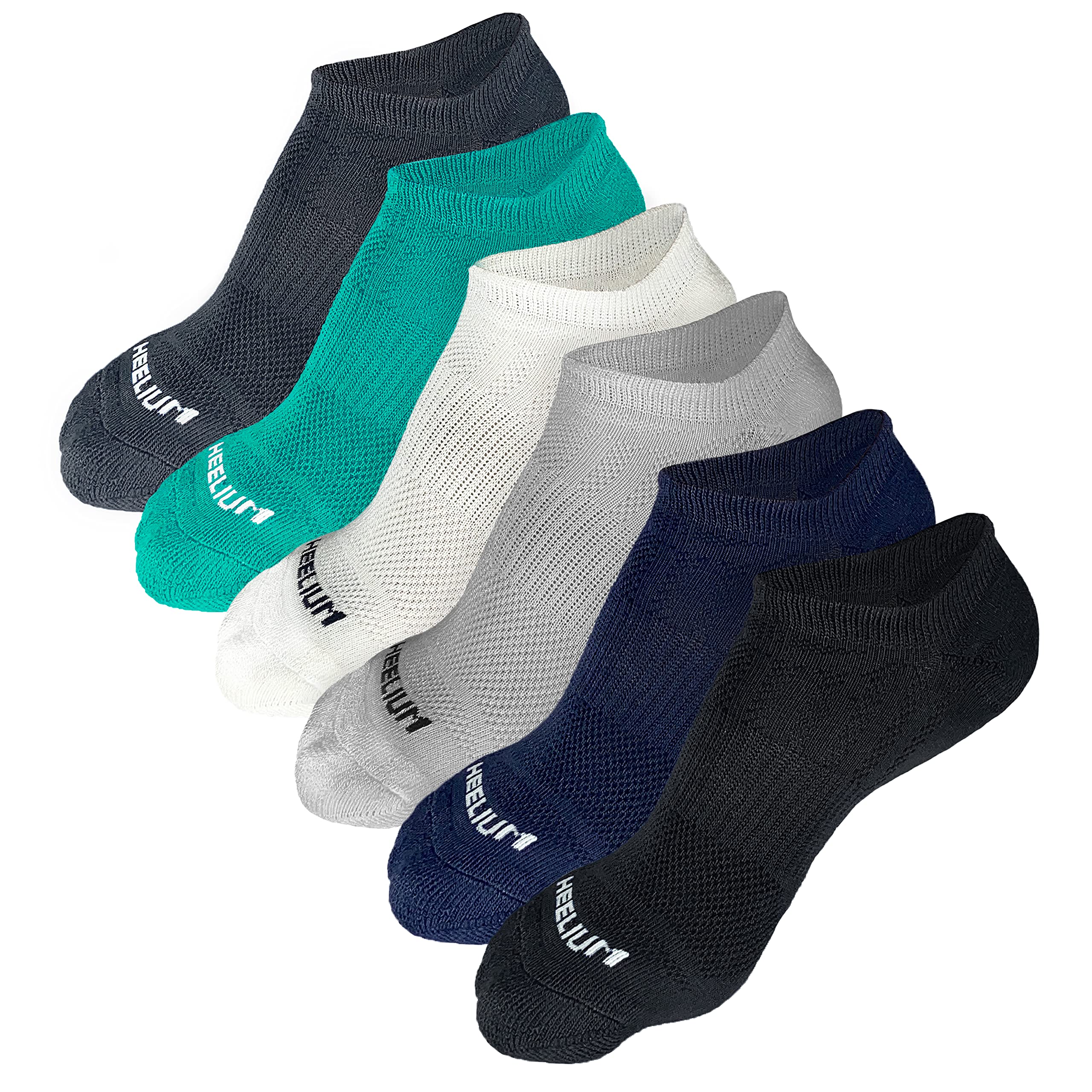 Brand: HEELIUMColor: Pack of 6 - Light Grey, Teal, Grey, Black, Off White, Navy BlueFeatures: 👣 PERFECT SIZE: Fits M UK 4-UK 8 (22 cm to 26 cm) & L UK 9-UK 13 (27 cm to 30 cm).⚙️ ENGINEERED FOR COMFORT: Innovative low cut design & cushion pads under toes & heels for extra comfort. Engineered mesh ensures super-fast moisture wicking which keeps your feet dry all day.🚫 ODOUR FREE: Odour control through natural anti-bacterial property of bamboo material. Inhibits the growth of odour causing bacteria that create foul foot smell. It also keeps your feet free from infections & the softness of the bamboo fabric prevents friction injuries like rashes and ulcers🧦 EXTRA SOFT & LIGHT: Bamboo fiber is...