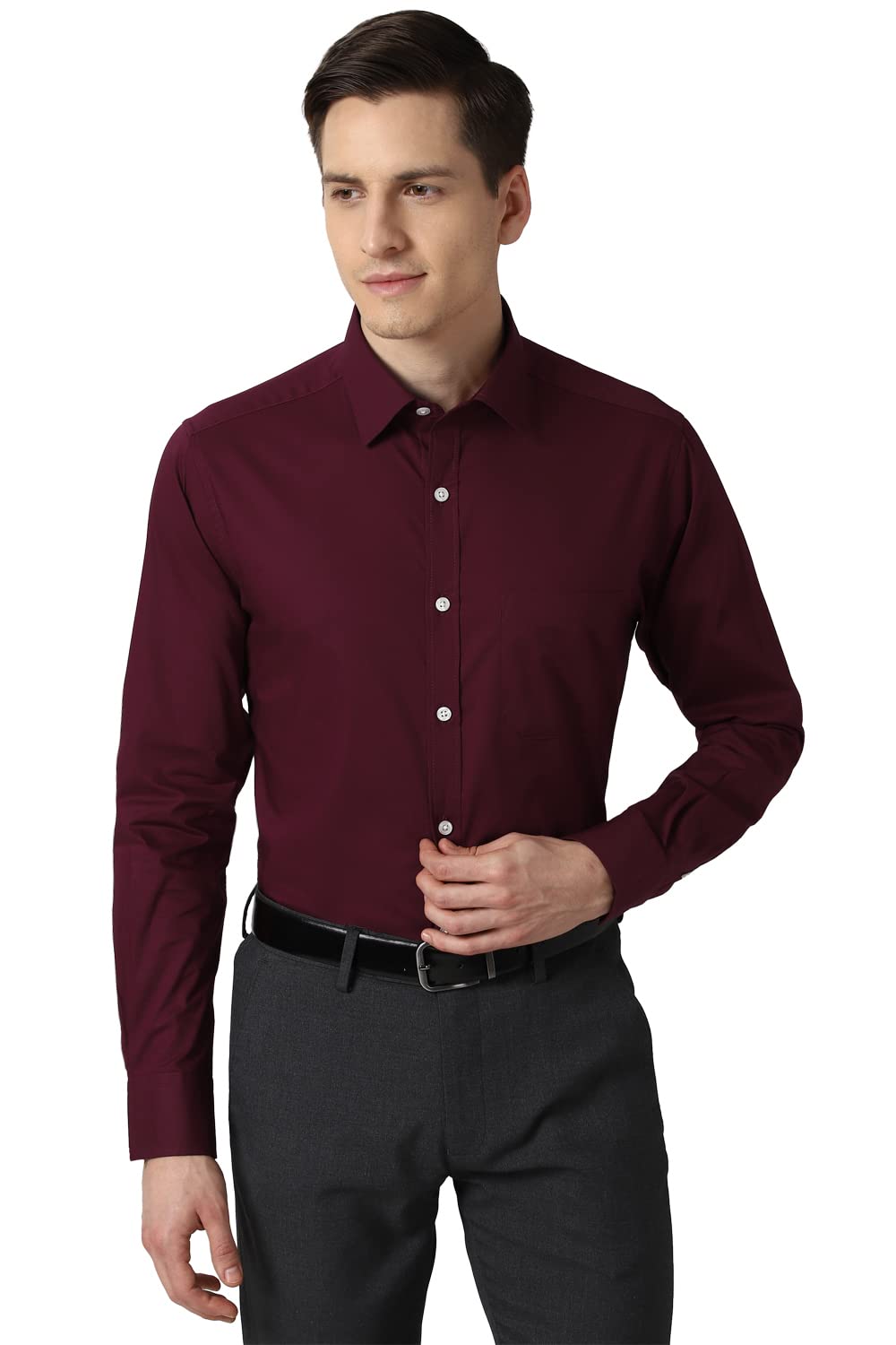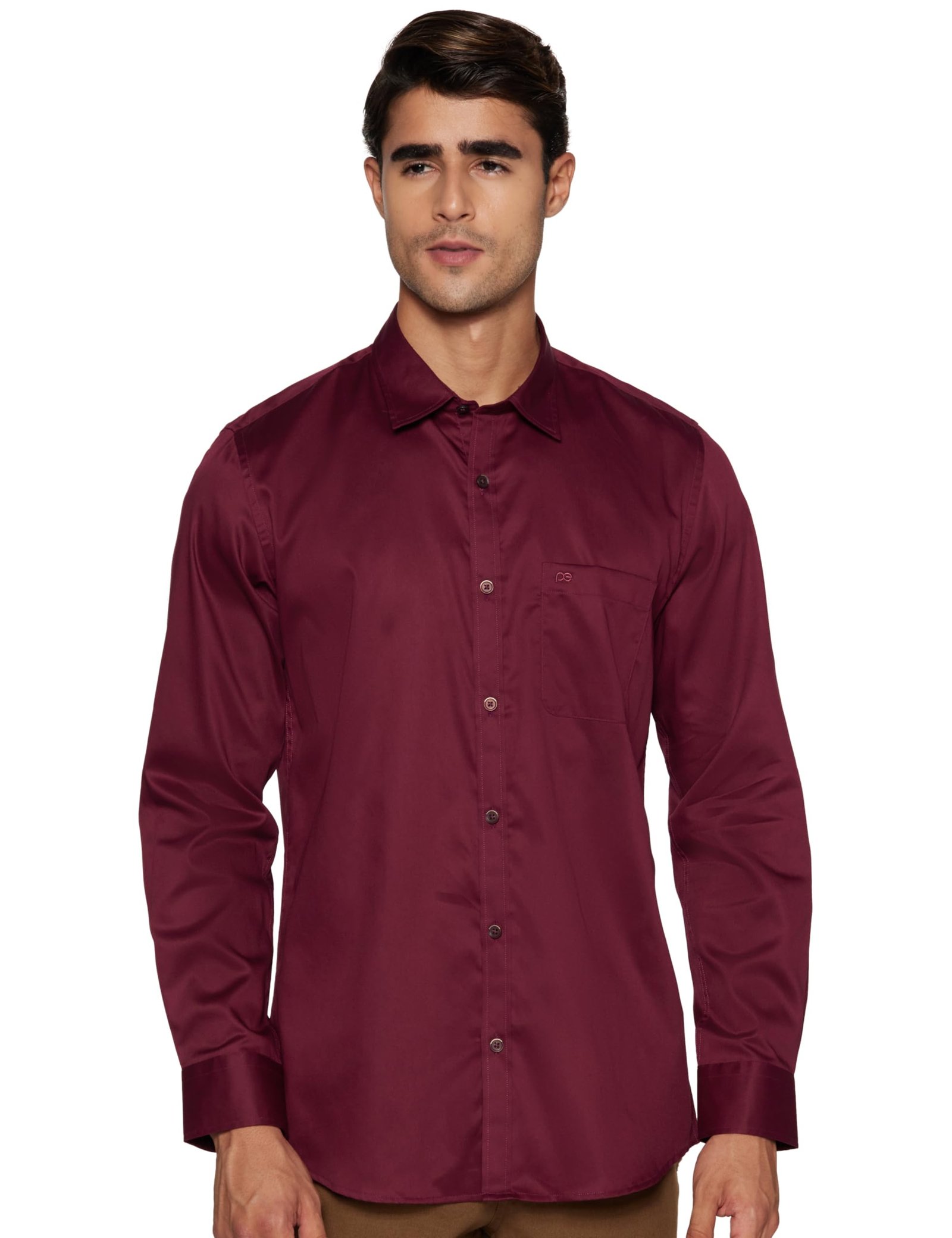 Brand: Peter EnglandColor: Dark MaroonFeatures: 100% Cotton Casual ShirtClassic Twill Shirt for timeless eleganceSlim FitFull SleevePackage Dimensions: 61x336x300Details: Description Crafted in 100% Cotton , this Maroon Solid Casual Full Sleeves shirt from Peter England Casuals features a Regular Collar and is tailored in Slim Fit.