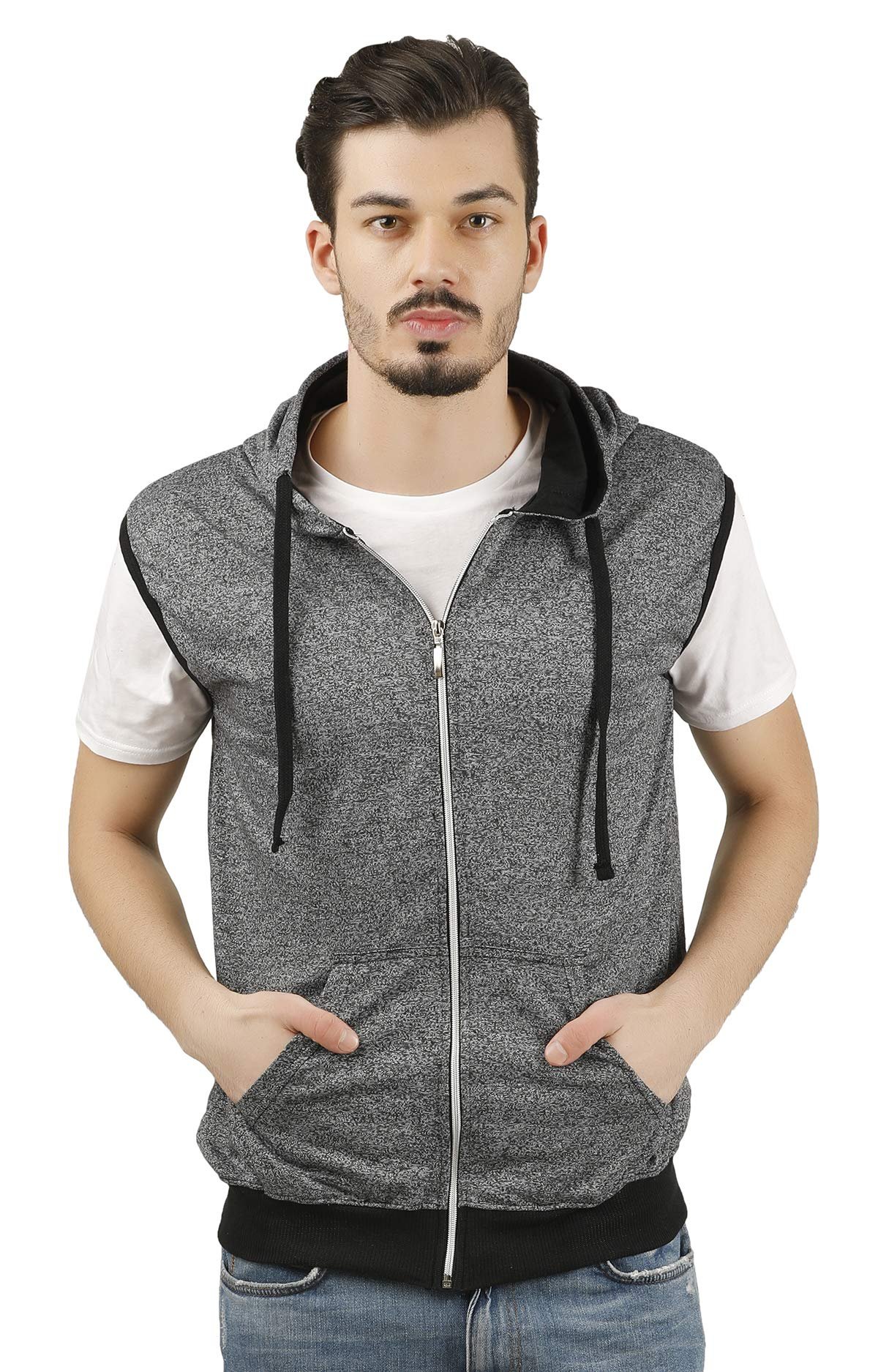 - Fabric: 100% Pure Cotton ; Premium Export Quality Branded T-shirt ; Unique Collection to your wardrobe casuals a hit of effortless cool with this best looking t shirt. Sleeve Type: Sleeveless ; Neck type: V Neck; Style: Zipper Hooded Jacket;.