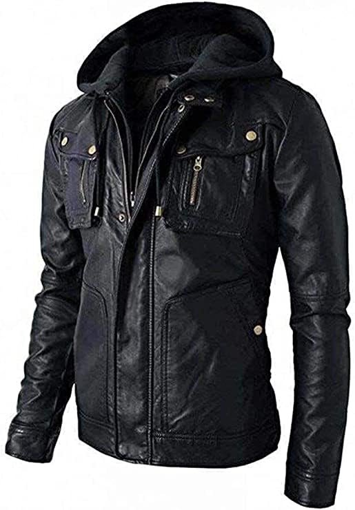 SID Military Grade Men’s Motorcycle Brando Style Biker Real Leather Hoodie Jacket – Detachable Hood, Dark Knight, Large Big